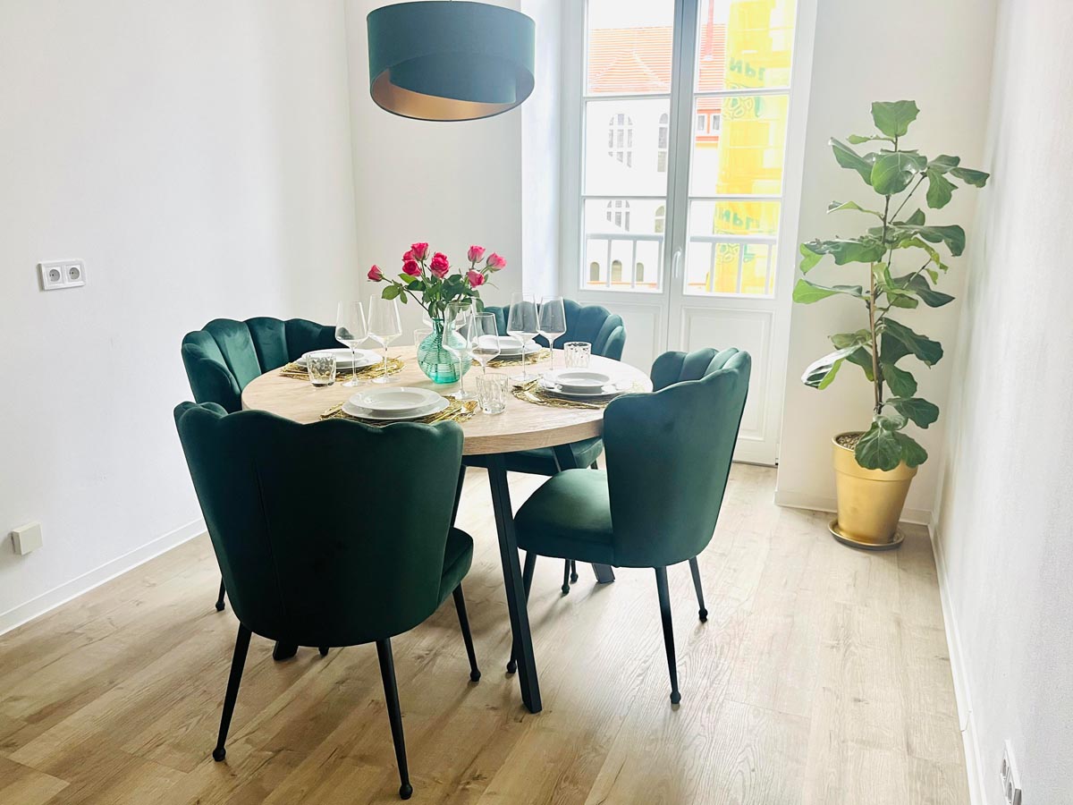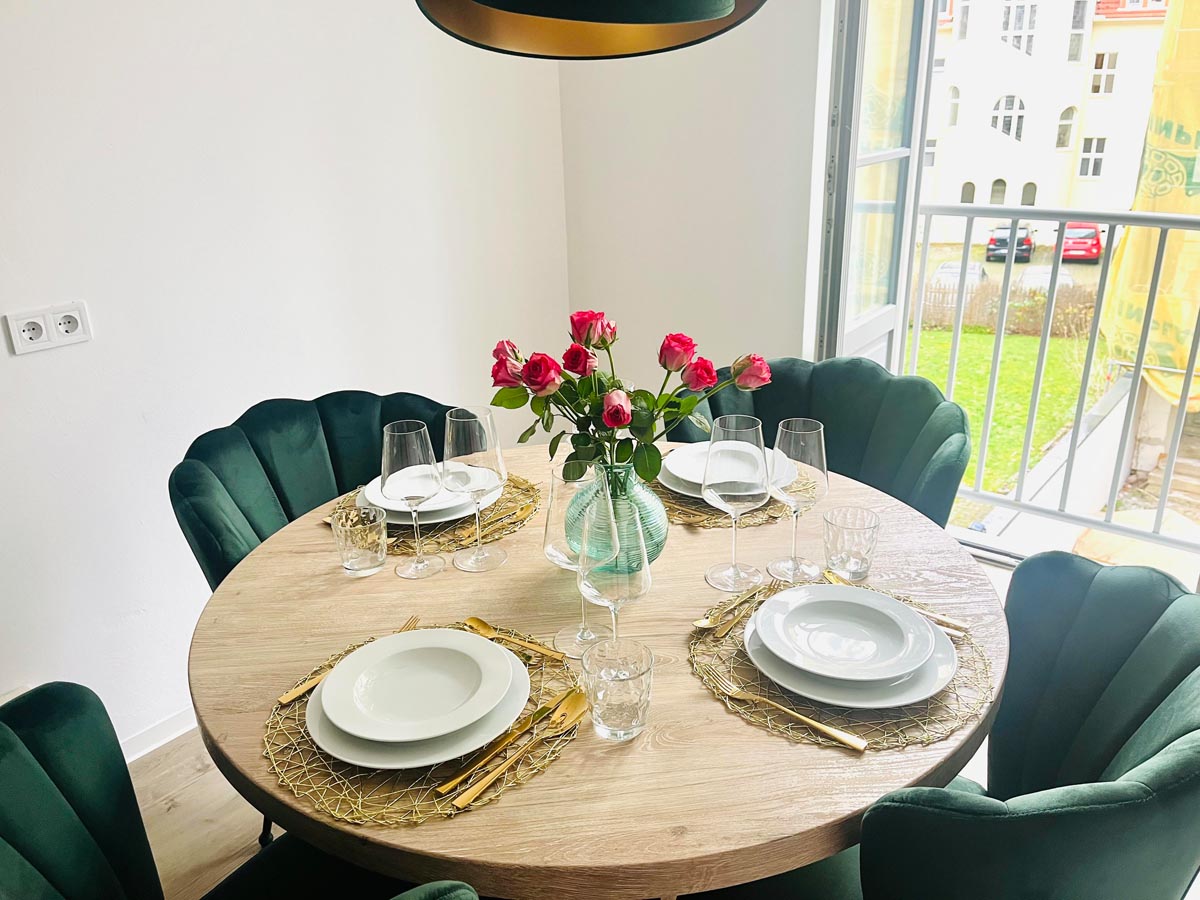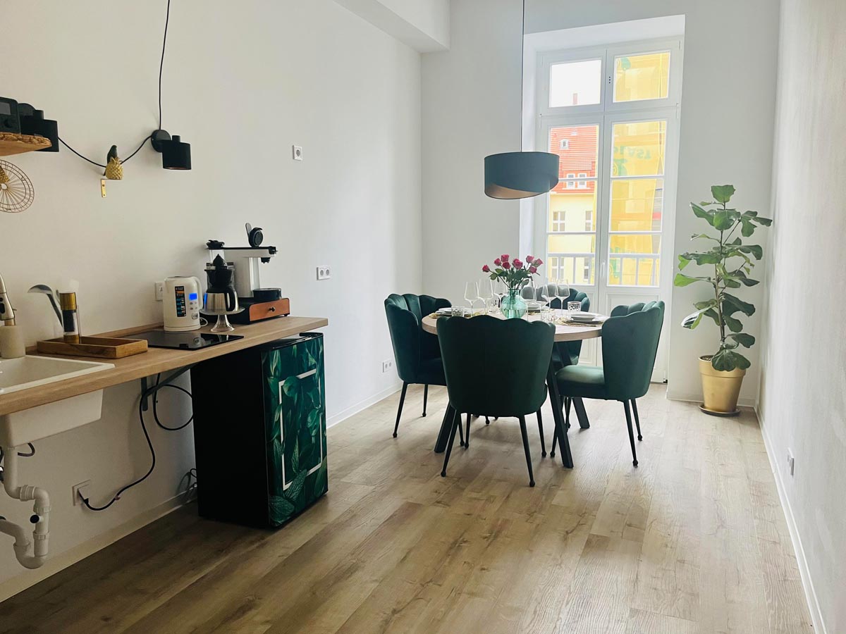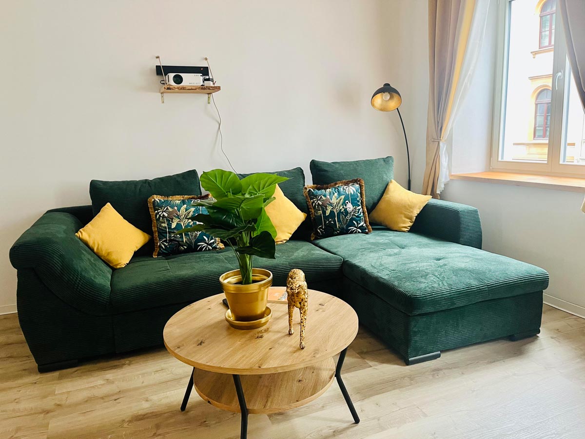 Die Wohnungen liegen unmittelbar in der ehemaligen florierenden Bismarckstraße, und heute findest du dort unter anderem einen gehobenen Friseur, zwei Bäckereien und Sachsens schönste "Fleischerei Büchner" wieder.